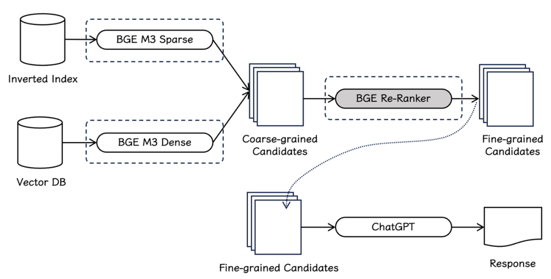 如图1所示,检索排序模型是信息检索及RAG pipeline中的重要组成部分。与向量模型与稀疏检索模型相比,检索排序模型会利用更加复杂的判定函数以获得更加精细的相关关系。通常,系统会首先借助向量模型(BGE-M3-Dense)与稀疏检索模型(BGE-M3-Sparse)分别从向量数据库与倒排索引中初步获取粗力度的候选文档(coarse-grained candidates)。紧接着,系统会进一步利用排序模型(BGE Re-Ranker)进一步过滤候选集,并最终获得精细的文档集(fine-grained candidates),以支持下游大语言模型完成检索增强任务(RAG)。