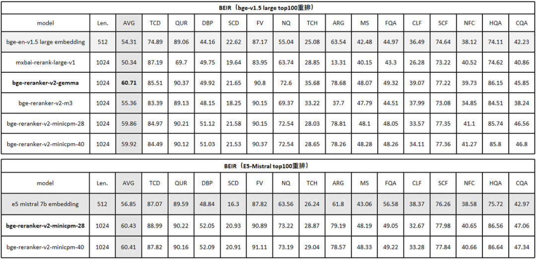 1. BGE Re-Ranker v2.0系列排序模型采用了两种不同尺寸的模型基座: