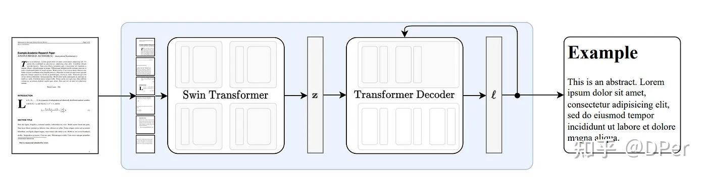 这里介绍一下Nougat[7],它基于Donut[8]开发,不需要与 OCR 相关的模块,总体架构图为: