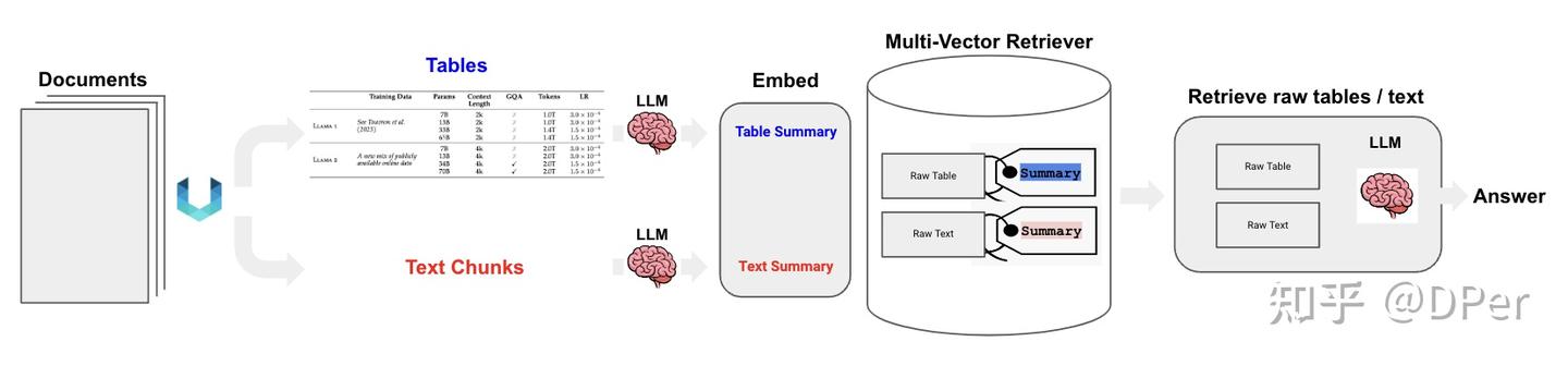 - 半结构化 RAG[5]:首先使用 Unstructured 从 pdf 中解析文本和表格,然后使用 multi-vector retriever 存储原始的表格和文本,同时对表格进行总结,最后用 LCEL 实现问答链路。主要流程如下所示(实际上这里的最后一个 LLM 并不是多模态 LLM)