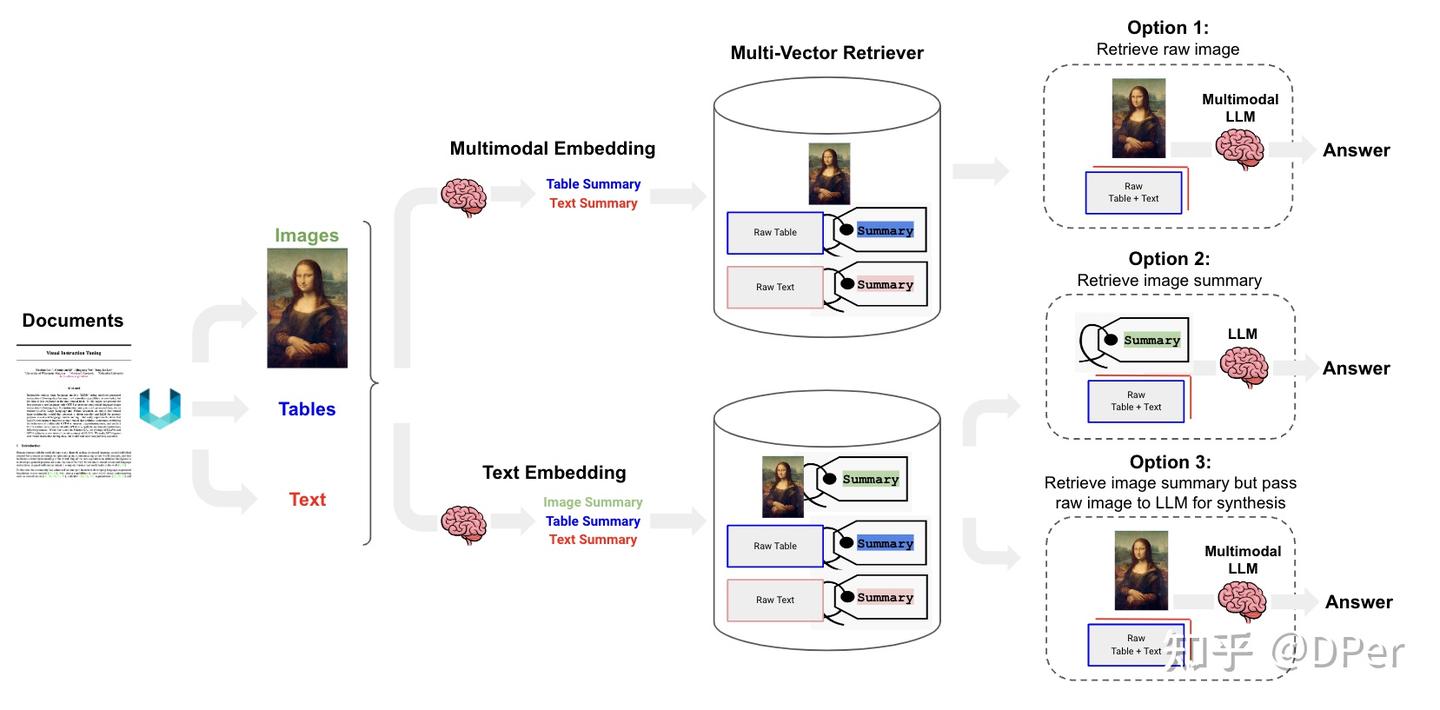 - 半结构化与多模态 RAG[6]:这个当中实际上提出了多种方案,如下图所示。 - Option1:和半结构化 RAG 类似,使用多模态 embedding(如 CLIP)对图像和文本进行 embedding,然后将原始图像和文本块传入到多模态 LLM 进行回答 - Option2:也是使用多模态 LLM,根据图像生成文本摘要,然后对文本进行 embedding,这样通过传统 RAG 链路即可进行 QA - Option3:从图像生成文本摘要,然后进行 embedding,但是 QA 的时候,根据 embedding 找到原始的图像,并使用多模态 LLM 进行回答