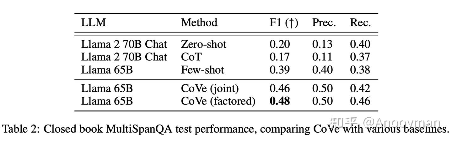 - 虽然 CoVe 方法试图减少幻觉,但并没有完全消除幻觉。这意味着 CoVe 仍然可以为给定的查询生成不正确或误导性的信息,即使它比基线有所改进。