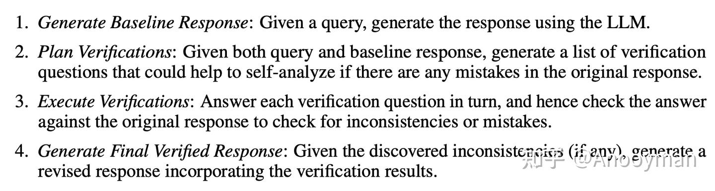 PS. 在这个过程中可以使用 RAG 或者检索验证的方法来判断回答内容是否存在幻觉。作者在 CoVe 的所有步骤中不打算使用任何工具只使用 LLM 本身。