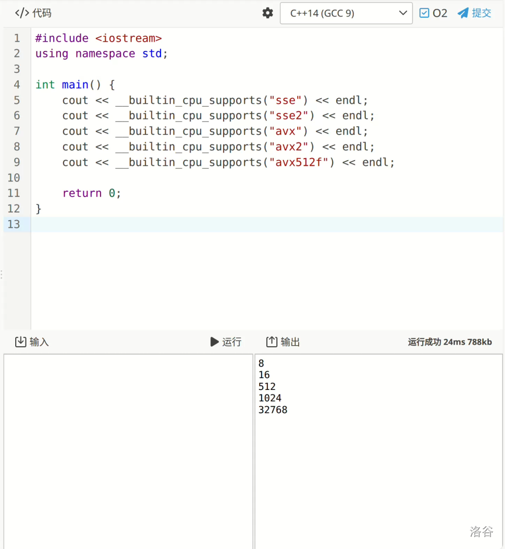 现在让我们看看洛谷的评测机支持哪些指令集。随便找到一道题打开 IDE,运行这个代码:
