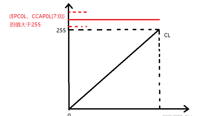 因为CL是会一直从00H到FFH的,即0 ~ 255,所以想让占空比为0,即一个周期内高电平的时间为0,也可理解为没出现过高电平,所以让{EPC0L,CCAP0L[7:0]}的值大于255即可