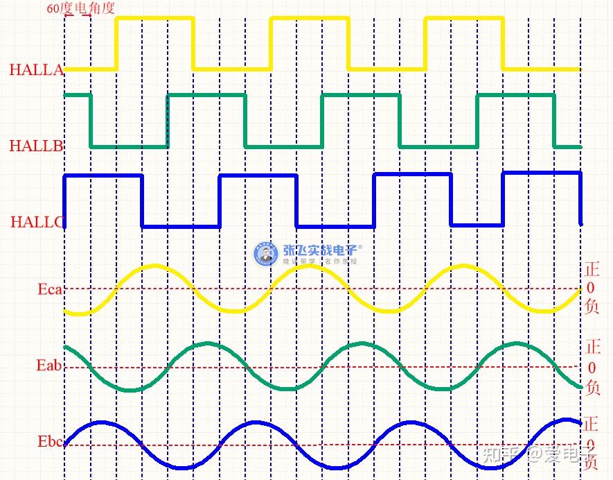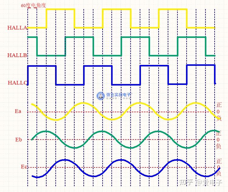 从图中我们知道,如果电机是顺时针转动,则Eab是超前Ea 30度电角度的,Eca是超前Ec 30度电角度的,Ebc是超前Eb 30度电角度的。根据这个线反电动势与相反转动势的相位关系,可以画出相反电动势与霍尔信号的波形。为了方便分析,下图八绘制出来三路霍尔信号与三路线反电动势的波形关系: