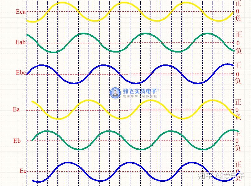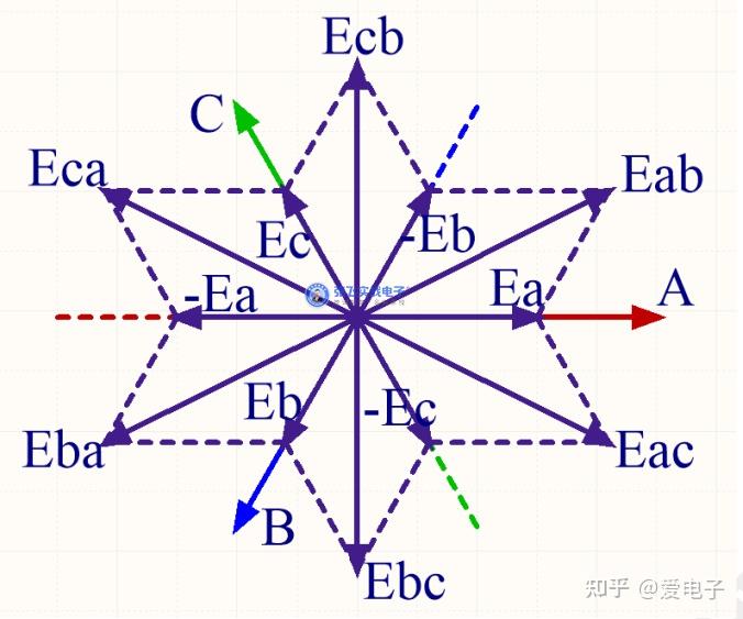 答:通过矢量合成的原理,例如Eac = Ea - Ec = Ea + (-Ec),绘制出矢量合成图,就可以知道线反电动势和相反电动势的关系,矢量合成图如下图所示: