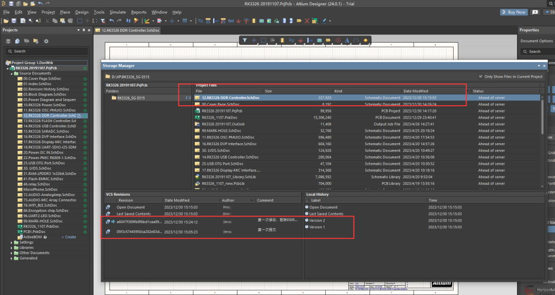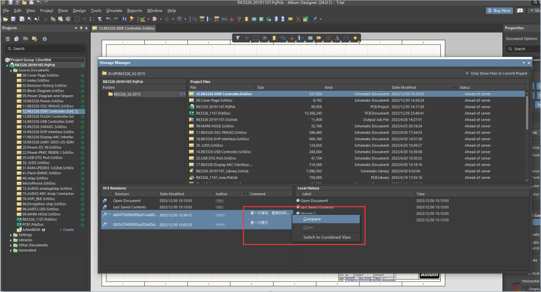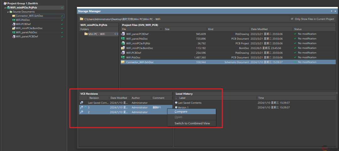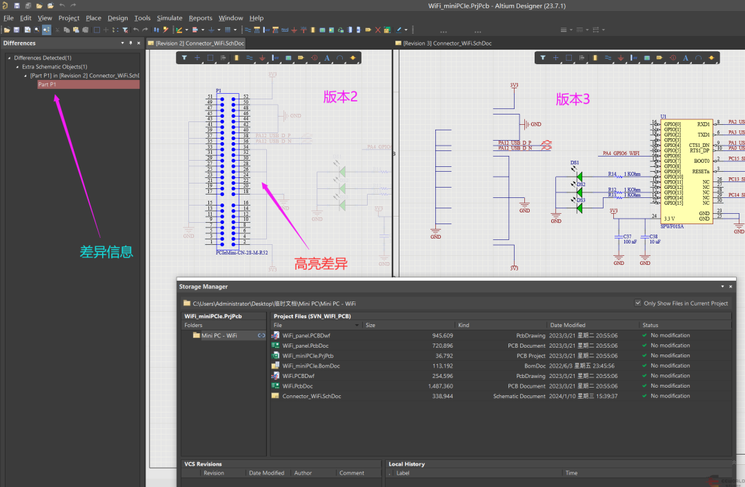 做硬件也是一样,但凡电路稍微复杂一点,今晚下班前做了什么修改,第二天早上可能就忘了。或者一个复杂的硬件产品已经迭代了好几个版本,现在需要对比这几个时间节点的差异,手动打开每一页的原理图去肉眼查找差异肯定是不现实的,这个时候就要靠版本管理工具了。