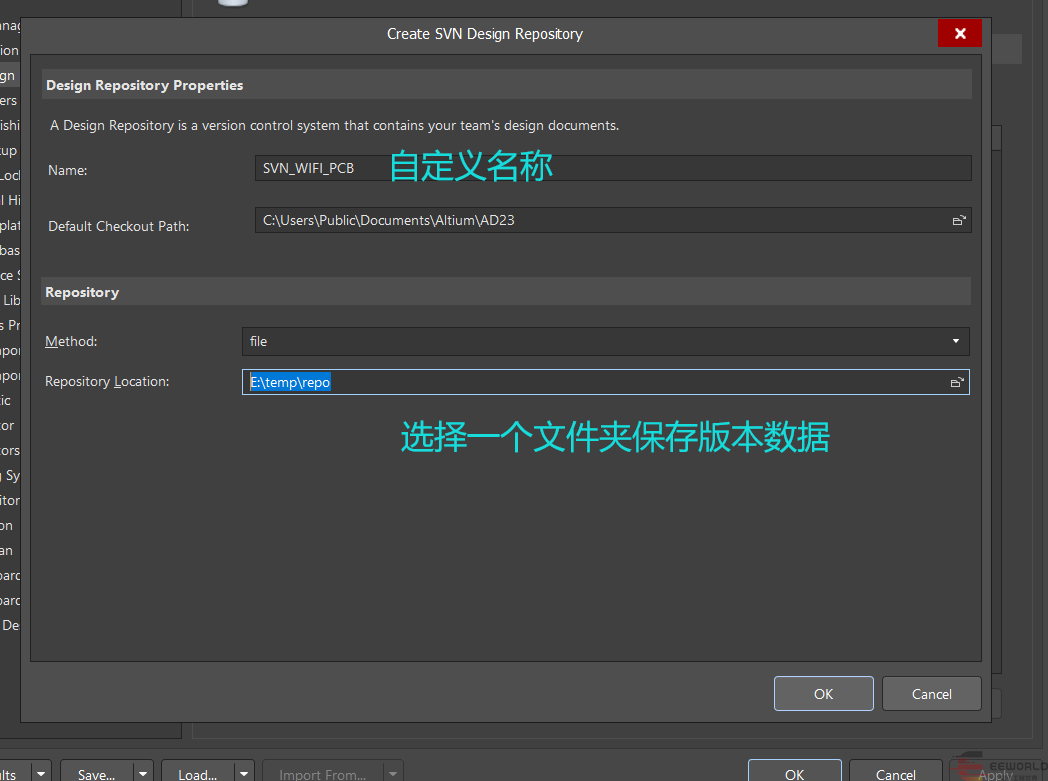 5. 弹出窗口填写SVN仓库名称和选择保存路径。