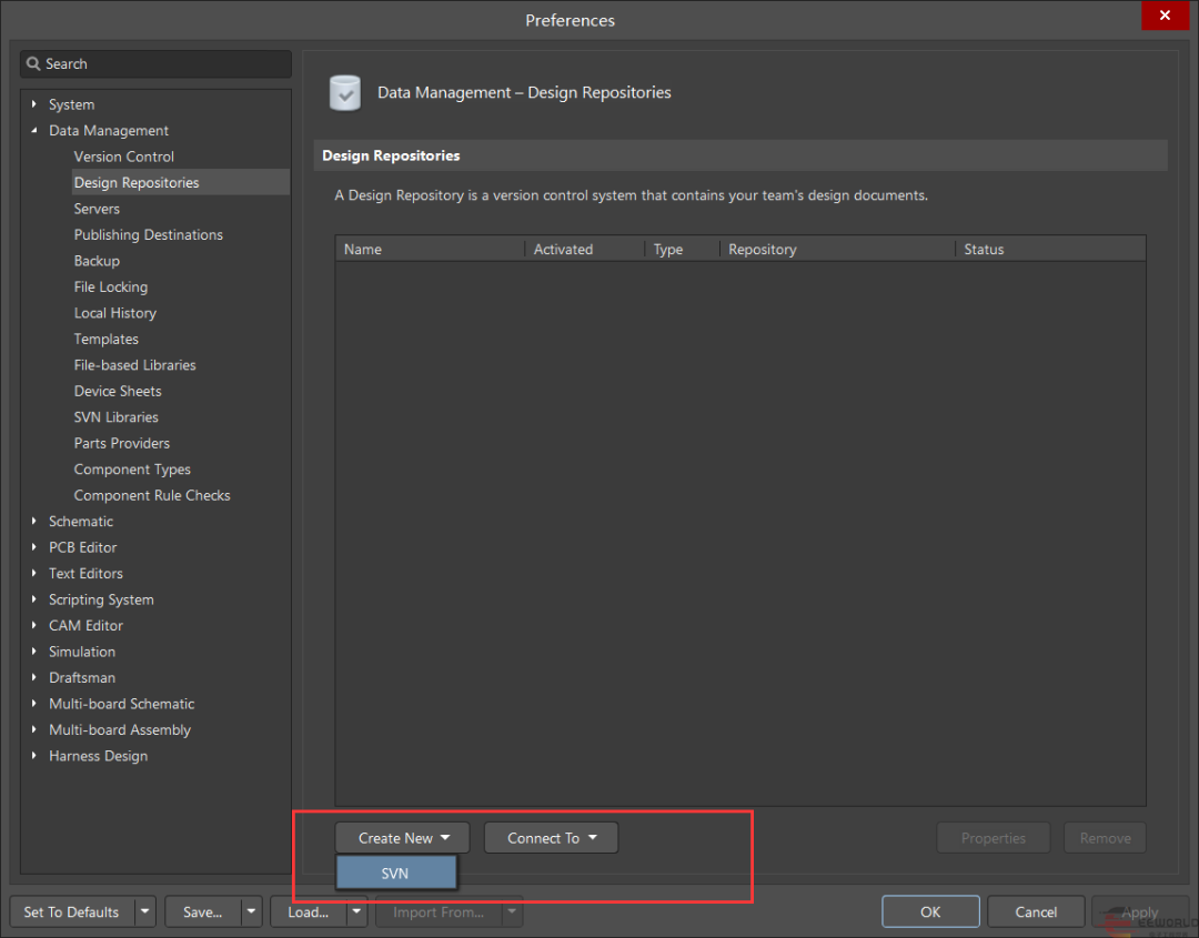 4. 弹出preference 菜单选择design repositories, 在create new下面选择SVN。