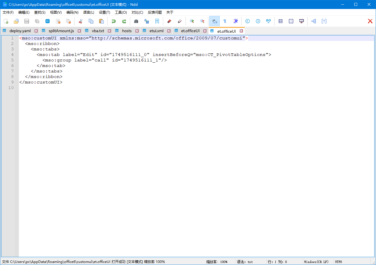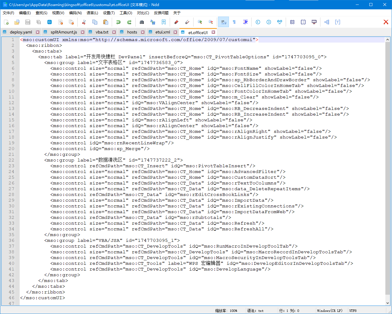 经过一番百度和必应,我首先找到了记录自定义功能区的文件et.officeUI,WPS中,用户的自定义功能区是通过读写该文件实现的。