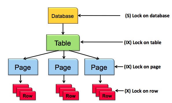 When we started talking about pessimistic concurrency 2 weeks ago, I told you that SQL Server acquires shared and exclusive locks on a record level. Unfortunately that's not the complete truth. The whole truth is that SQL Server acquires locks at different granularities(粒度), such as the database, the various pages, and finally at the record level. SQL Server implements a complete lock hierarchy, which is shown in the following picture.