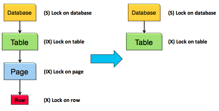 Imagine the following scenario: you update 1 million of records that are spread across 200.000 data pages. In that case you need 1.000.000 X locks on the records themselves, 200.000 IX locks on the various pages, and one IX lock on the table itself. In sum your query acquires 1.200.001 locks, which needs around 110 MB of lock space in the lock manager - just for one single query. Regarding the memory footprint this approach is very dangerous. For that reason SQL Server triggers a lock escalation as soon as you have acquired more than 5.000 locks at one level - such as the record level. In that case SQL Server escalates your individual fine grained row level locks to one coarse(粗糙的; 粗鄙的; ) grained table lock: