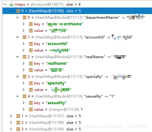 通过debug查看, maps的结果,可以看到, 在list集合的maps中, 存储了四个map集合.