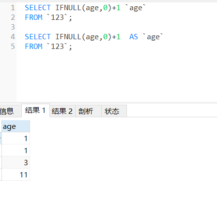 select 列名1 (as) 别名1,列名2 (as) 别名2 from 表名; select `id` `编号`,`name` `名字`,ifnull(`age`,0) as `age` from `student` as s;