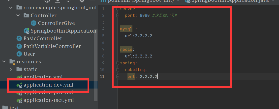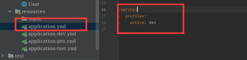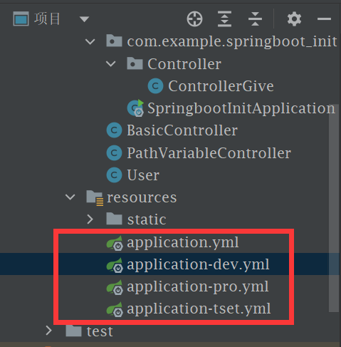 在application.yml中选择要使用哪个配置环境,是dev本地环境,还是test测试环境,还是产品上线的pro环境。
