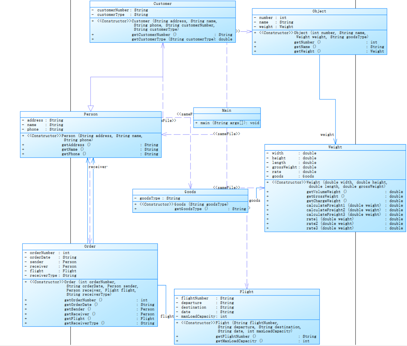 通过这次作业,我对类的设计和继承的理解确实更深了。比如 Customer 继承 Person,这样可以复用姓名、电话这些属性,代码一下子简洁了很多。还有集合的使用也更熟练了,以前老是搞不清楚泛型怎么用,现在算是有点感觉了。总的来说,虽然过程有点痛苦,但看到代码能正常跑起来,输出正确的结果,还是很有成就感的。下次写代码前一定要先把类图设计好,特别是这种有继承关系的,不然改起来太费劲了。还有就是要多写注释,这次注释写得太少,自己后面看的时候都有点迷糊了,通过了上次电梯题目对于自身能力的提升,在这次航空货运管理系统题目写代码的过程中,能够自己独立完成代码的编写,在看到题目的时候也能够有自己的想法设计相应的类应该有怎样的类与类之间的关系,是依赖还是什么。然后是否应该用继承来实现代码,也能够有自己的判断,相信在后续的学习中能够对于java知识的运用越来越熟练,我自己在课后也会吸取这次写题目过程中的教训,在下次的题目中能够将代码完成的更好。