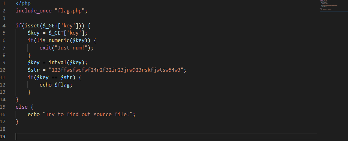 观察代码,发现有两个判断,一个是判断变量key是否是一个数字,如果不是就会输出just num!并且退出。且下面if里面有个判断,只要$key == $str (这是一个弱判断,只要这个字符串和key的值相同即可)