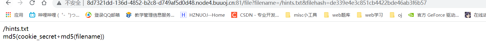 结合url里面的file?filename=/hints.txt&filehash=de339e4e3c851cb4422bde46ab3f6b57提醒我得到flag的方式就是file?filename=/fllllllllllllag&filehash=md5(cookie_secret+md5(/fllllllllllllag))