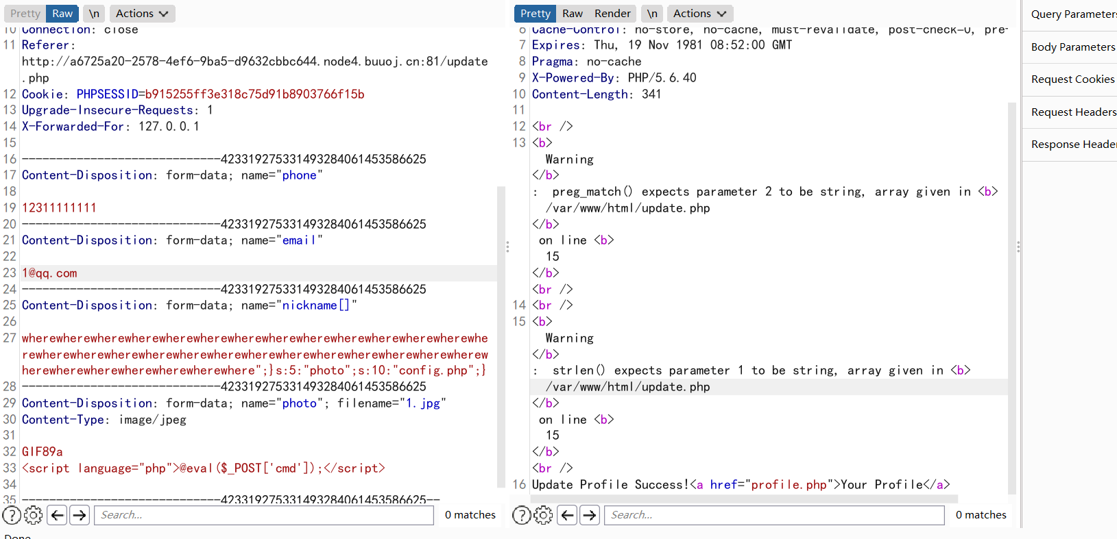 审计代码,发现可以很简单的去绕过nicename那个preg_match()方法,用数组报错就可以绕过这种判断,可以上传任意参数。然后还有一个地方是可控的是上传照片那个地方,所以这两个是最可能存在漏洞的地方。