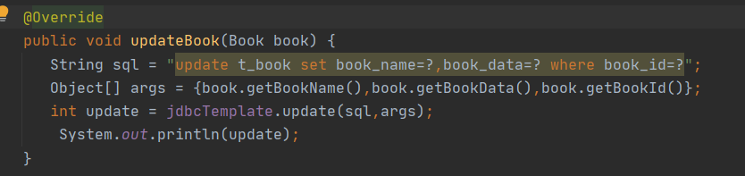 queryForObject(SQL语句,RawMapper是接口(New BeanPropertyRowMapper<Book>(Book.class)),SQL语句中问号的值)