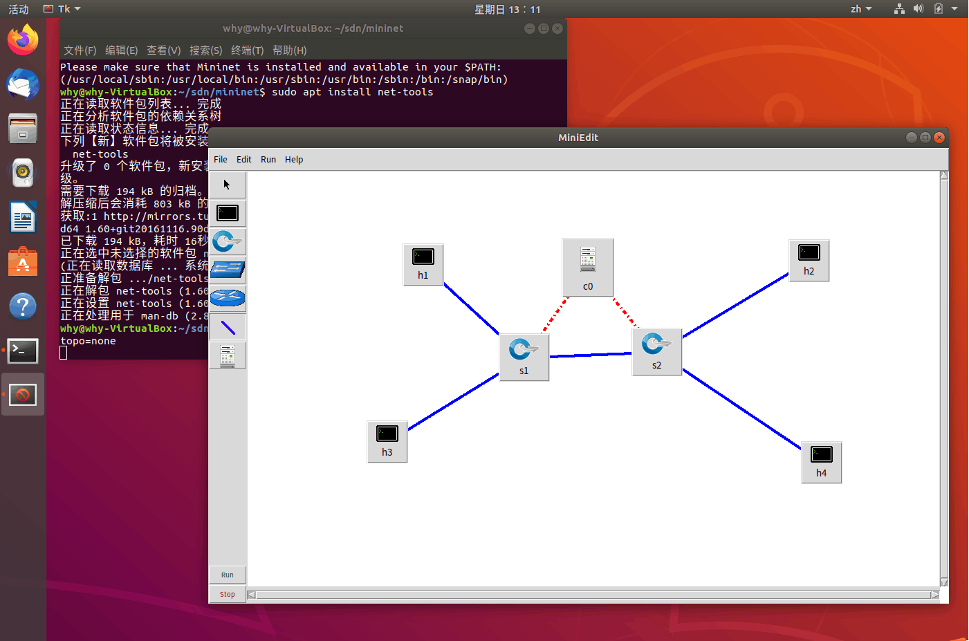 掌握 Mininet 的源码安装方法和 miniedit 可视化拓扑生成工具。
