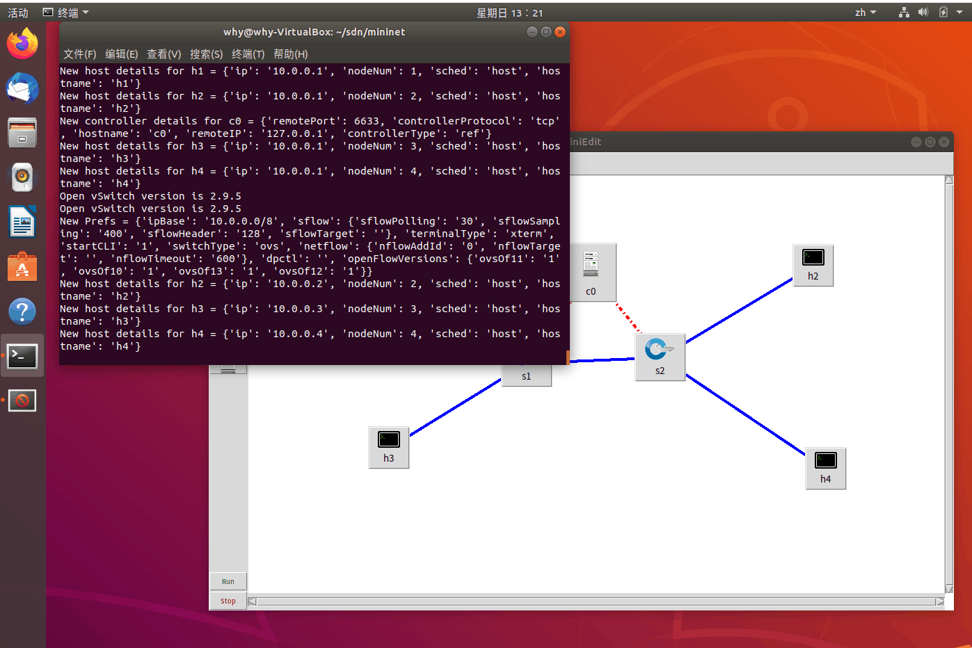 使用源码安装 Mininet 的 2.3.0d6 版本,并使用可视化拓扑工具生成一个最简拓扑(1 台交换机连接 2 台主机)。