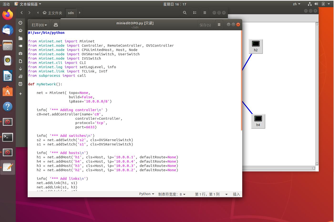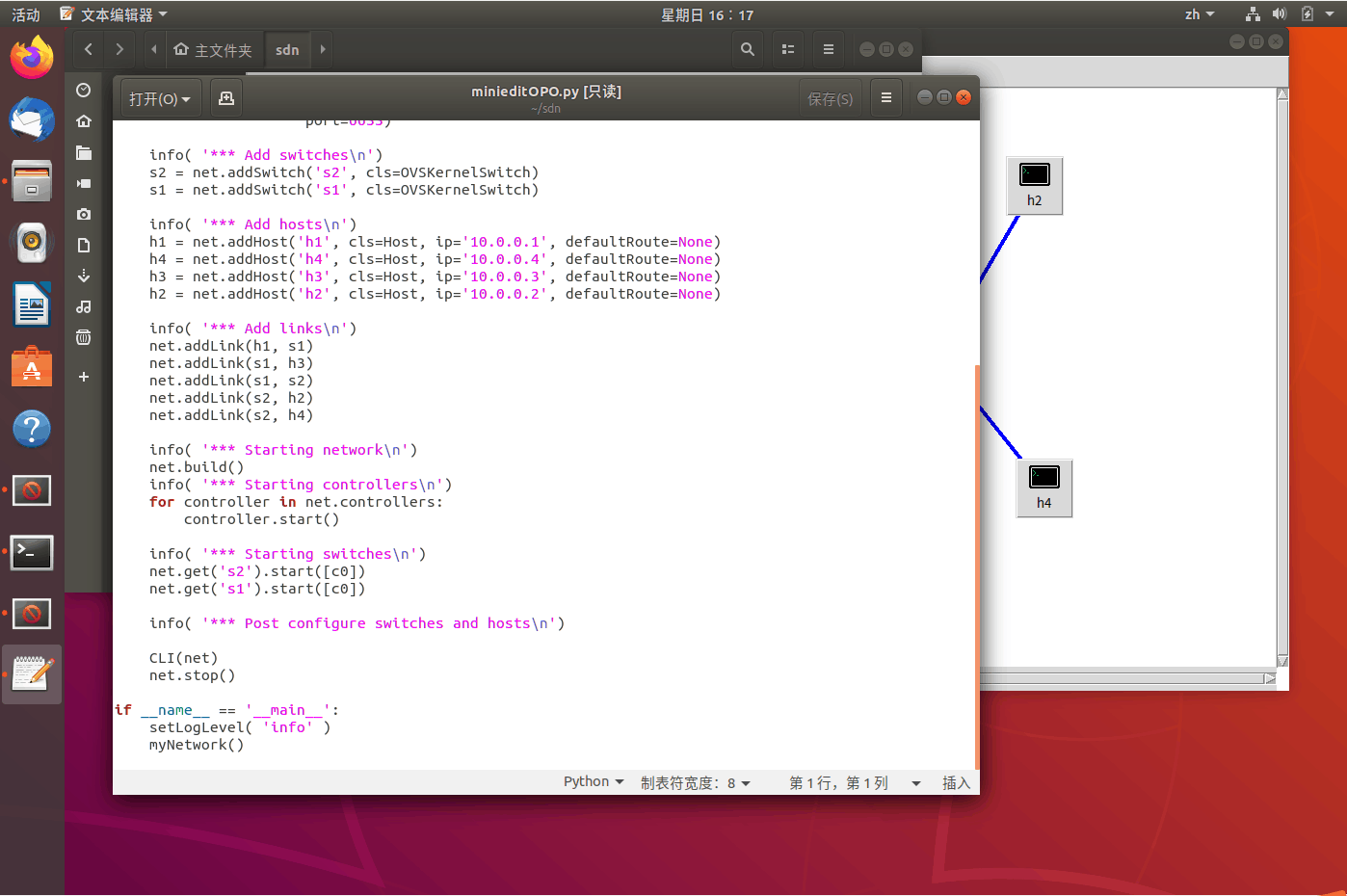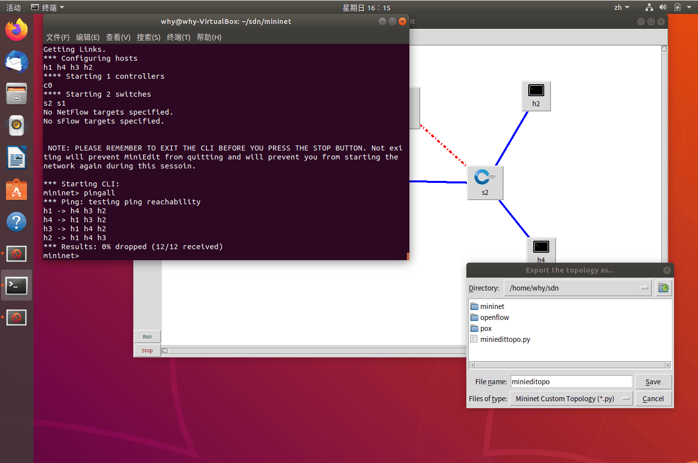 拓扑生成并确认无误之后,可以点击 miniedit 左上角的 File 菜单,选择 Export Level 2 Script,将拓扑保存为 Python 脚本,方便之后执行脚本一键生成。