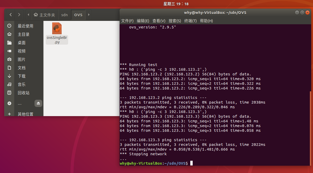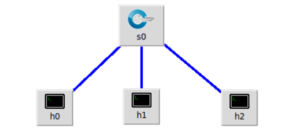 脚本对应的拓扑如上图所示,执行 ovsSingleBr.py,在没有控制器的情况下,在Mininet 脚本中通过调用 ovs 命令直接向 switch0 交换机下发流表,将入端口号为1/2/3 的数据包泛洪广播,并对目的地址为 192.168.123.1/2/3 的数据包分别从1/2/3 端口转发出去。之后测试 h0 ping h1,h0 ping h2,网络连通。