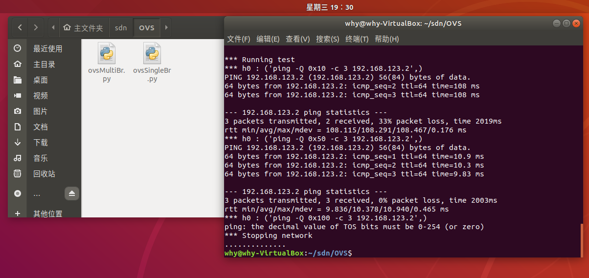 在本实验中,使用 Mininet 基于 Python 的脚本,调用“ovs-vsctl”命令直接控制Open vSwitch。使用默认的交换机泛洪规则,设置更高的优先级规则进行预先定义 IP 报文的转发。在多个交换机中通过设置不同 TOS 值的数据包将通过不同的方式到达目的地址,验证主机间的连通性及到达目的地址的时间。