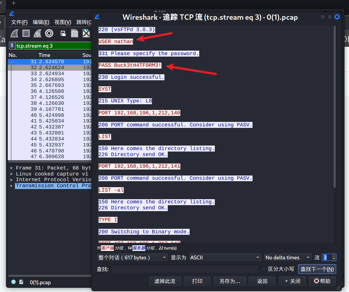 追踪 TCP 流,发现了 FTP 的账号和密码
