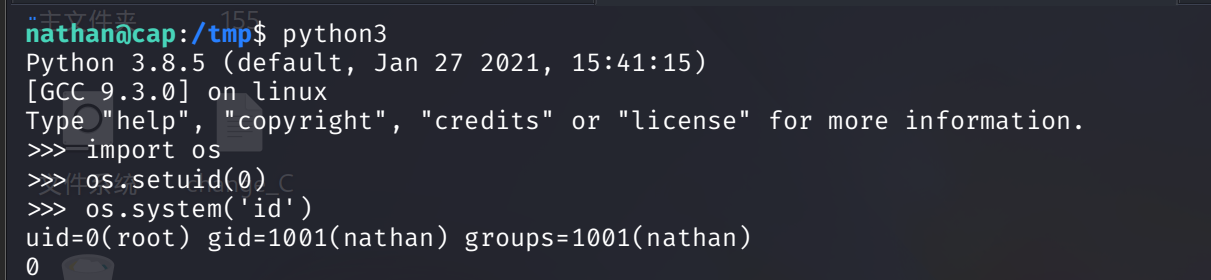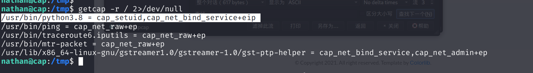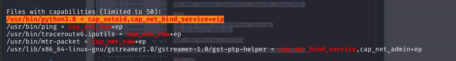 cap_setuid): 截图里显示/usr/bin/python3.8拥有cap_setuid+eip。这里的cap_setuid就是那个被切出来的小块权限,它相当于给了 Python 一张**“任意易容面具”**,允许它在运行过程中随意更改自己的 UID(用户 ID),包括改成 0(也就是 root 专属的 ID)。