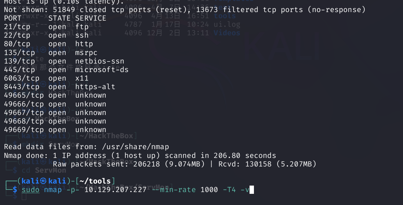 sudo nmap -p21,22,80,135,139,445,6063,8443 -A 10.129.207.227 --min-rate 1000 -T4 -v