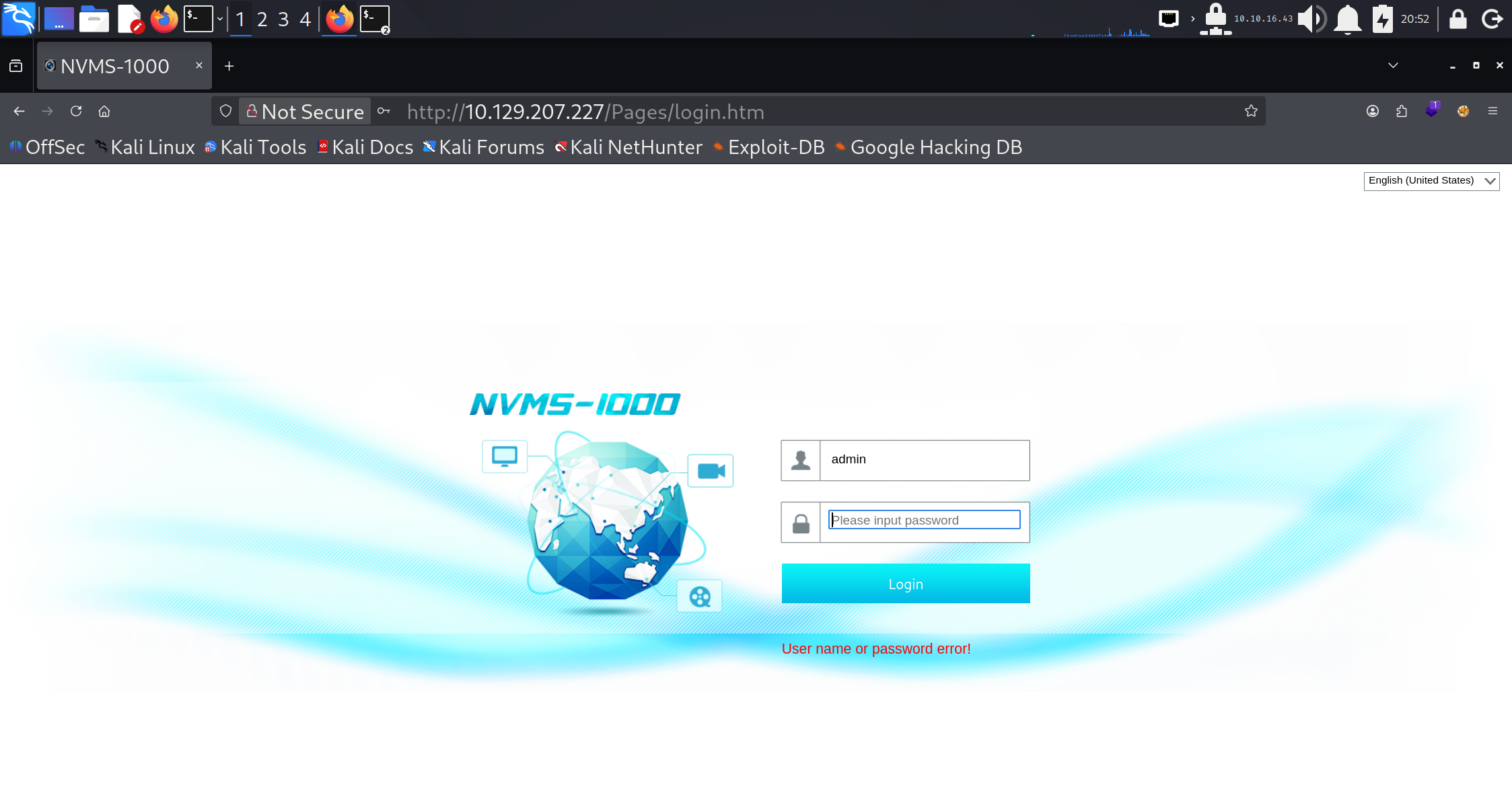 在浏览器中查看端口 80 时,会显示 NVMS-1000 网络监控软件的登录页面。默认凭据 admin / 123456 或其他常见凭据均无法让我们获取访问权限。