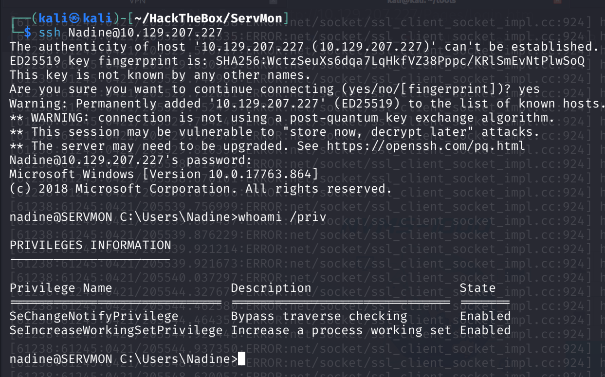 密码 L1k3B1gBut7s@W0rk 被发现适用于用户名 nadine ,并以该用户身份打开了一个命令控制台。然而,通过执行命令 whoami /priv 可得知,此用户并无特权权限。