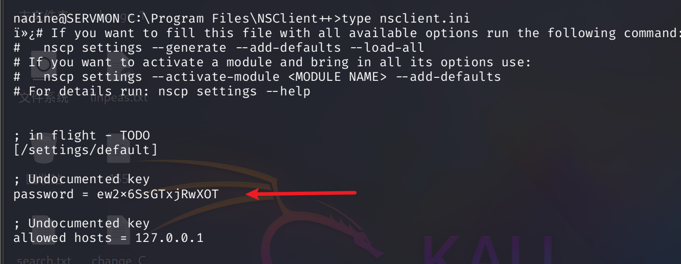 对文件系统的枚举显示出了非默认目录 C:\ProgramFiles\NSClient++\ 。该目录内包含有 NSClient 的 .ini 文件。让我们对其进行读取。