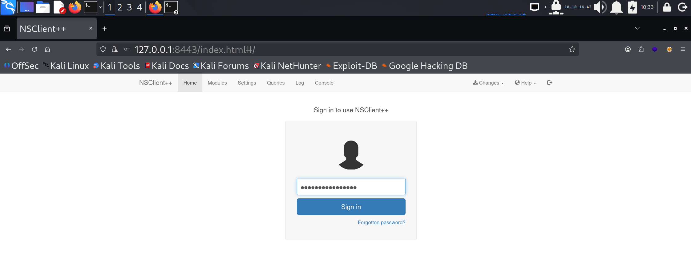对端口 8443 的检查显示出现了 NSClient++ 的登录界面。尝试使用普通密码进行登录亦未成功。