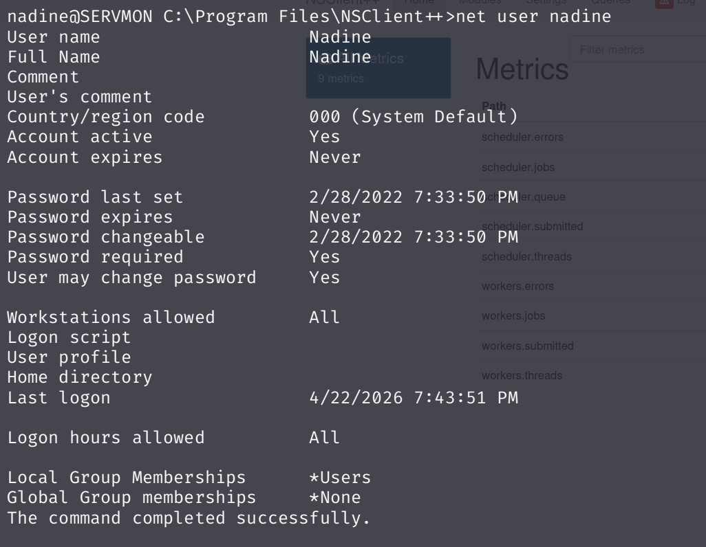 ServMon is an easy Windows machine featuring an HTTP server that hosts an NVMS-1000 (Network Surveillance Management Software) instance. This is found to be vulnerable to LFI, which is used to read a list of passwords on a user's desktop. Using the credentials, we can SSH to the server as a second user. As this low-privileged user, it's possible enumerate the system and find the password for NSClient++ (a system monitoring agent). After creating an SSH tunnel, we can access the NSClient++ web app. The app contains functionality to create scripts that can be executed in the context of NT AUTHORITY\SYSTEM. Users have been given permissions to restart the NSCP service, and after creating a malicious script, the service is restarted and command execution is achieved as SYSTEM.