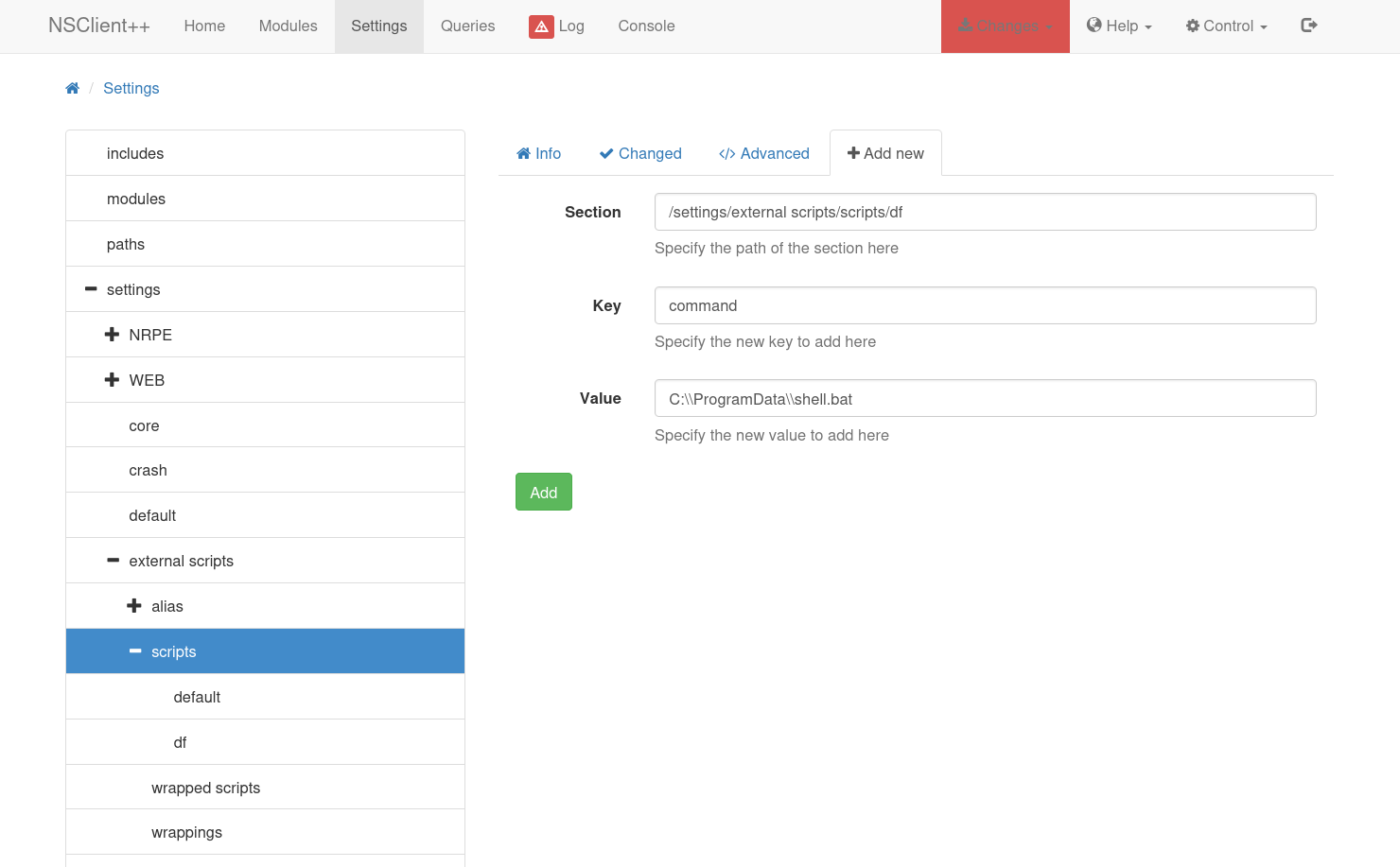 - 在 NSClient++ GUI 中,首先我将通过单击“设置”>“外部脚本”>“脚本”,然后单击“+添加新脚本”将我的脚本与命令关联起来。