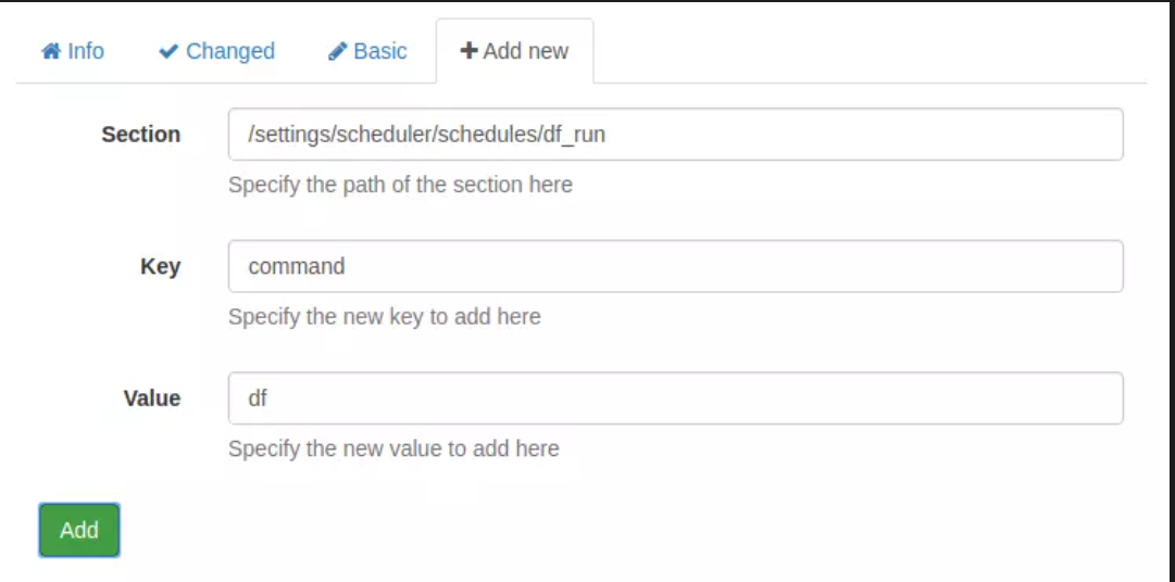 点击“添加”后, df 现在会出现在上方脚本下方,“更改”选项卡会变成红色。我可以进入“更改”并将此更改保存到磁盘配置中。这将向配置文件添加以下内容: