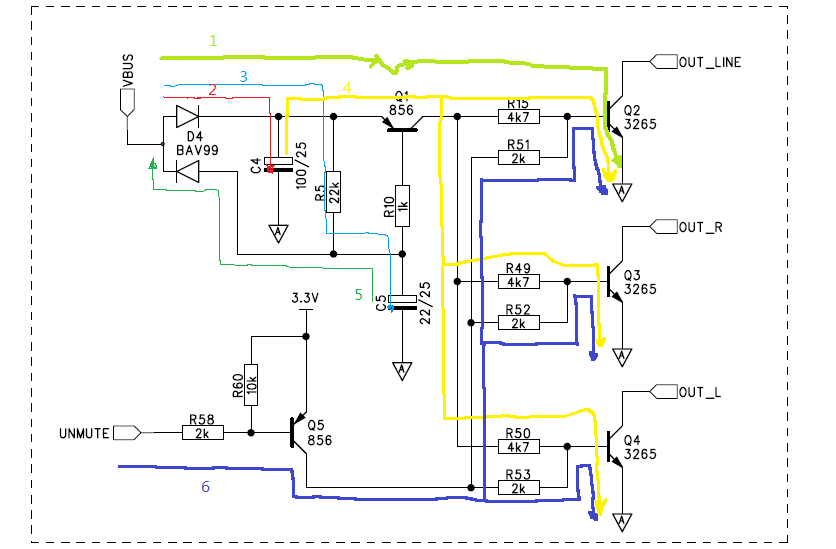 上电过程中,UNMUTE电平一直保持为低电平,使Q5导通,从而Q2-4也导通,拉低输出,实现MUTE.