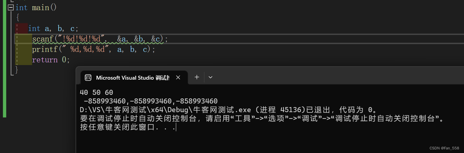 3、scanf()函数允许将格式字符放入到格式字符串内,除空格字符以外的普通字符必须与输入字符严格匹配
