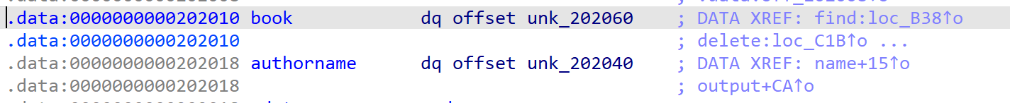 我们发现book和authorname都在bss段上,前者对应地址0x202060,后者对应地址0x202040,两者相差0x20。然而name函数中,我们可以写入的长度刚好为32!于是那一字节隔断符就会溢出到book[0]的内容中,造成漏洞。