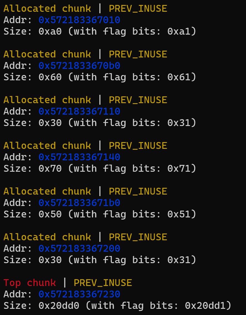 你可能会像我一样好奇会不会发生malloc(0);之类的问题,事实上这会返回一个可以free但不能被解引用的指针,对应一个“极小chunk”,对做题没有影响。